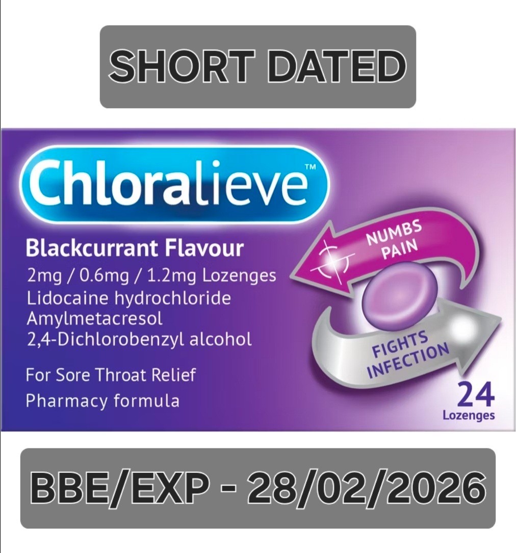Chloralieve Blackcurrant Lozenges 24 Sore Throat Pain Infection SHORT DATED