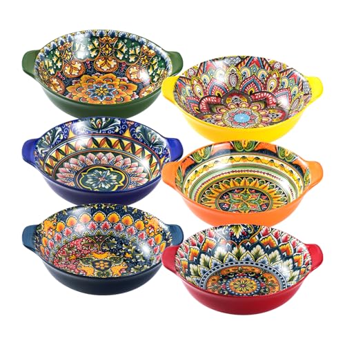 Henten Home Bowls Set, Porcelain Cereal Bowl with Handles, Colorful Serving Plates 6pcs - 17.5Oz, Ceramic Bowls for Cereal / /Pasta/Soup/Salad - Bohemian Style