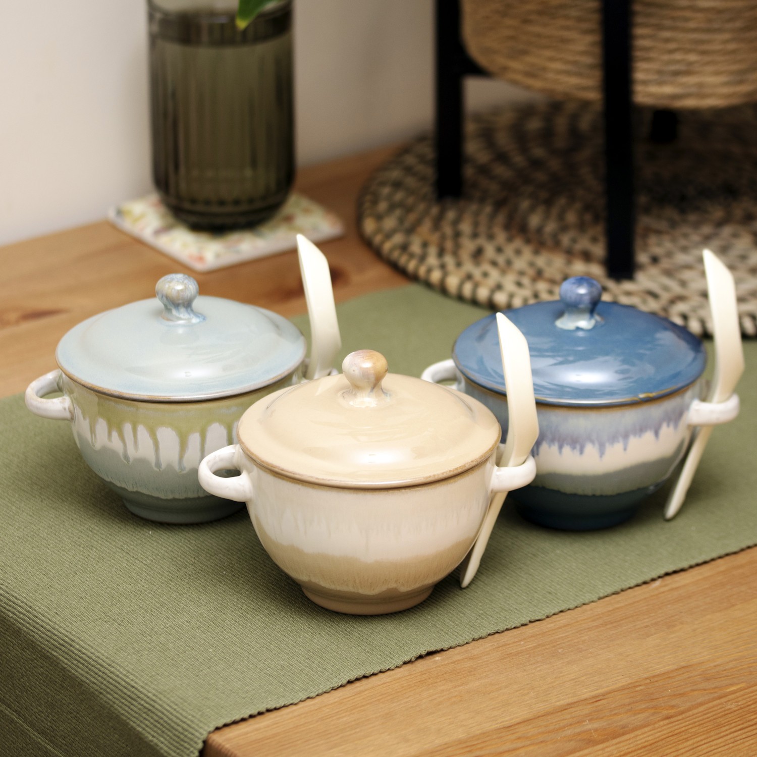 Set Of 3 Coastal Reactive Glaze Soup Bowls With Lid Spoon & Handles Stoneware
