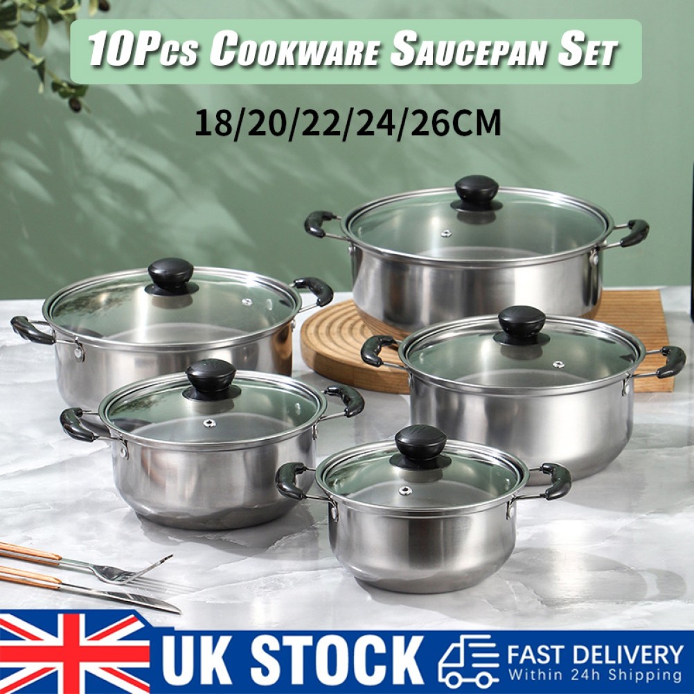 10 Piece Stainless Steel Cookware Soup Pot Set 16-24cm Kitchen Cooking Glass Lid