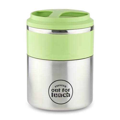 Pioneer Vacuum Insulated Lunch Box 2 Tier, Leak-Proof Food/Soup Flask with Extra Wide Opening and 2 Compartments, 4 Hours Hot 8 Hours Cold, 18/10 Stainless Steel - Green, 1.5 Litre