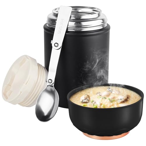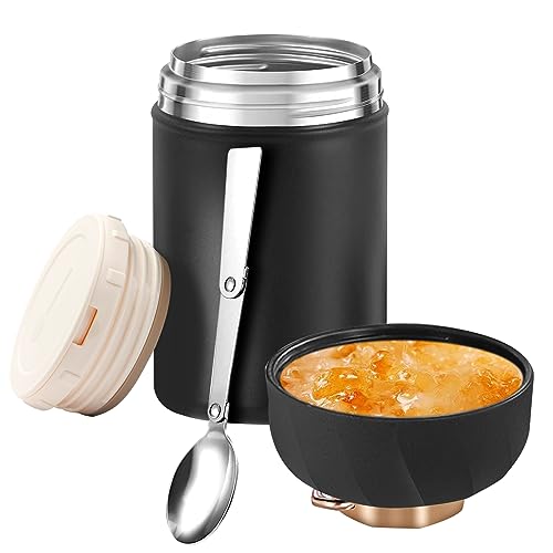 Food Flask,600ml (20 oz) Food Flask Container,Stainless Steel Double Walled Soup Flask Leak Proof Food Jar Soup Containers with Foldable Spoon for Hot and Cold Meals Double Soup Flask (Black)