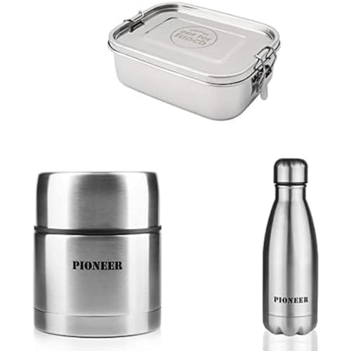 Pioneer Out for Lunch Stainless Steel Lunch Box with Cutlery Included 800ml Capacity Vacuum Insulated Soup/Food Flask, 500 ml Vacuum Insulated Stainless Steel Reusable Bottle 500ml