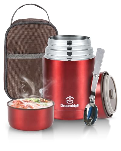 Dreamhigh® Thermal Food Flask, 800ml, Soup Flask with Spoon, Stainless Steel Vacuum Insulated Food Container, Leak-Proof, with Carrying Bag, Keep Hot/Cold for 12 Hours (Red)