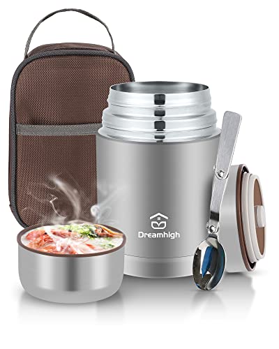Dreamhigh® Thermal Food Flask, 800ml, Soup Flask with Spoon, Stainless Steel Vacuum Insulated Food Container, Leak-Proof, with Carrying Bag, Keep Hot/Cold for 12 Hours (Silver)