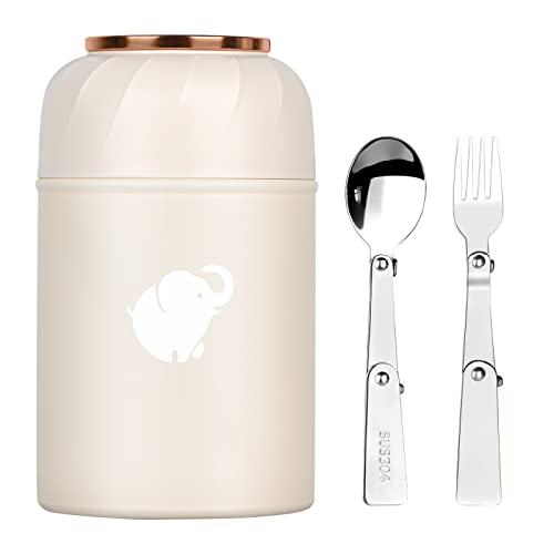 Khobisoft Food Flask With Folding Spoon, 600ml (20oz) Stainless Steel Jar for Hot and Cold Meals Double Walled Soup Flask Leakproof Food Jar Soup Containers (white)