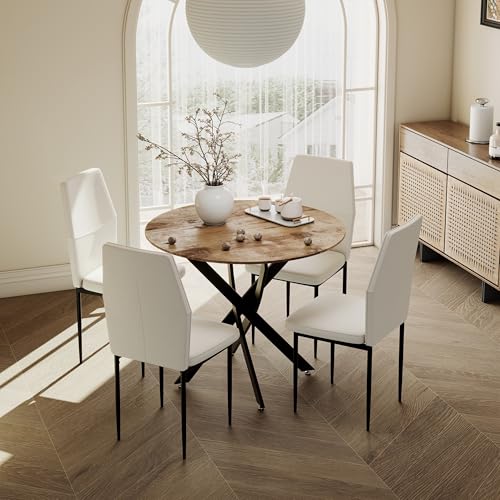 Homullel 110cm Dining Table and 4 Chairs, 4 Seater Kitchen Table and Chairs Set for Space Saving, Compact Dining Room Set for 4, 110x70 cm, Wooden, White (4 Seaters, Faux Leather Eggshell White)