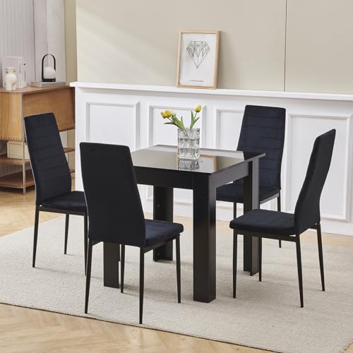 Pantanal Square Dining Room Set for 4, 75cm Black Dining Table with 4 Black Velvet Dining Chairs, 5-Piece Kitchen Table Set Dinette Set for Small Apartments, Space Saving Home Kitchen Furniture