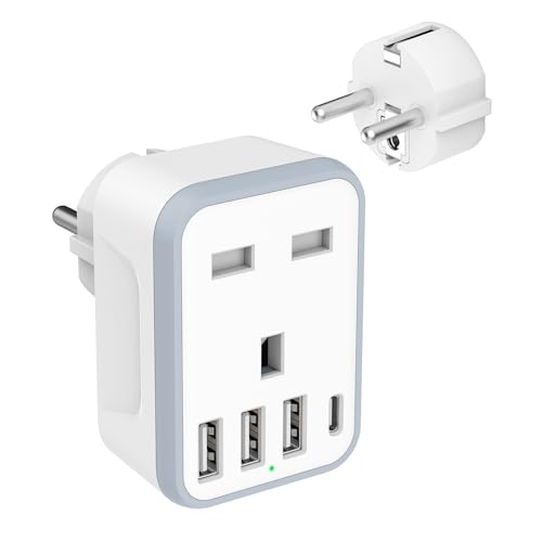 UK to European Travel Adaptor with 4 USB Ports(1 USB C), Grounded EU Euro Europe to UK Power Plug Adapter for Germany Spain France Iceland Greece Poland Netherlands Austria Turkey etc (Type E/F)