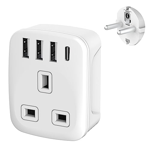UK to European Travel Adaptor with 4 USB Ports(1 USB C), Grounded EU Euro Europe to UK Power Plug Adapter for Germany Spain France Iceland Greece Poland Netherlands Austria Turkey etc (Type E/F)
