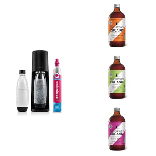 SodaStream Terra Sparkling Water Maker Machine, with 1 Litre Reusable BPA-Free Water Bottle for Carbonating & 60 Litre Quick Connect CO2 Gas Cylinder – Black + 3 x Organic Flavours Drink Mixes