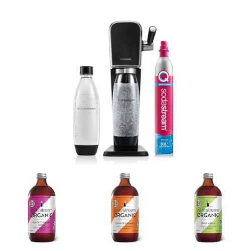SodaStream Art Sparkling Water Maker, Sparkling Water Machine & 1L Fizzy Water Bottle, Retro Drinks Maker w. BPA-Free Water Bottle & 60L Co2 Gas- Black + 3 x Organic Flavours Drink Mixes