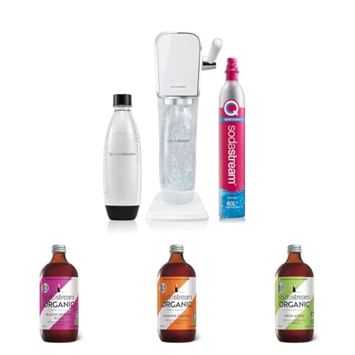 SodaStream Art Sparkling Water Maker, Sparkling Water Machine & 1L Fizzy Water Bottle, Retro Drinks Maker w. BPA-Free Water Bottle & 60L Co2 Gas- White + 3 x Organic Flavours Drink Mixes