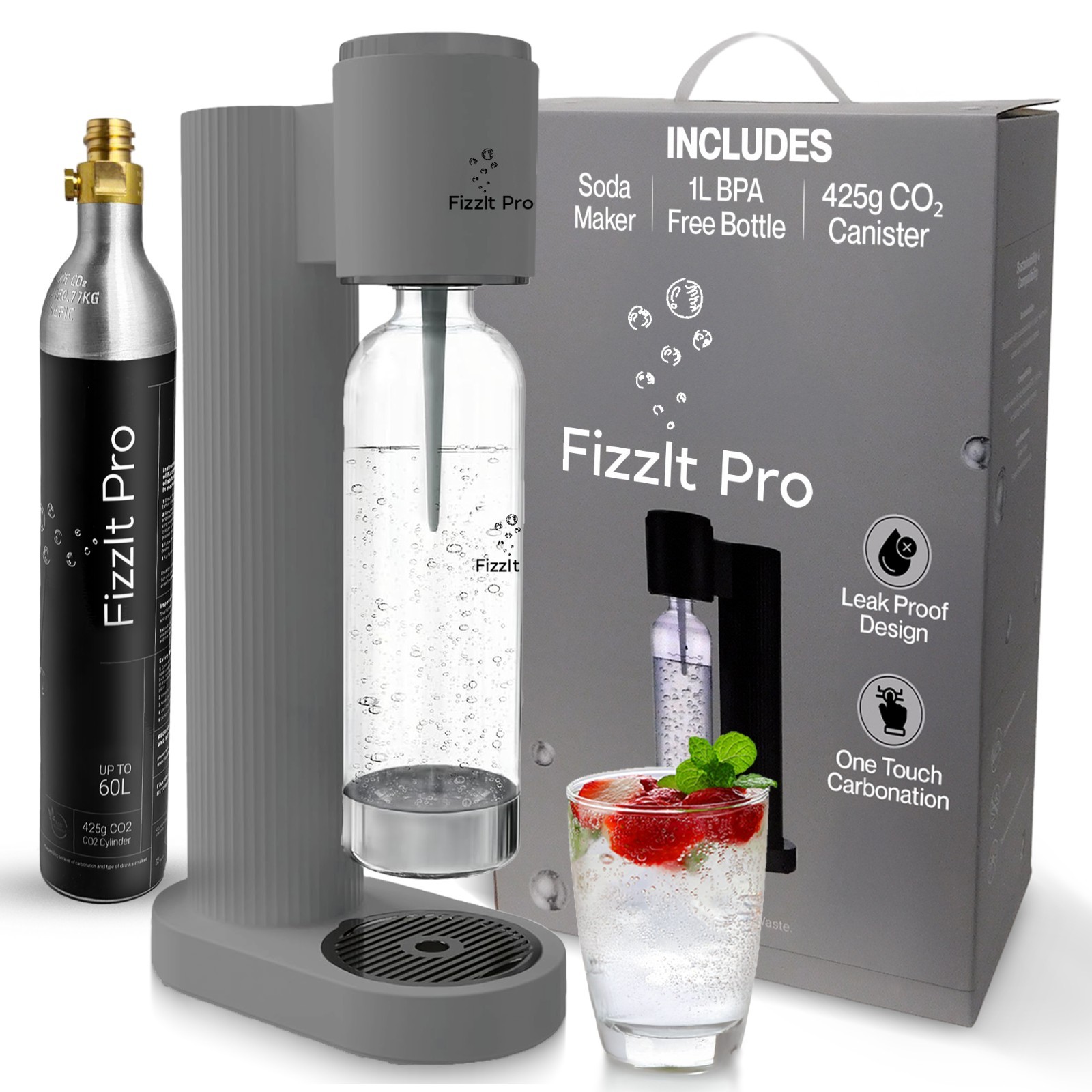 NEW FizzitPro Sparkling Water Soda Maker + CO₂ Gas Cylinder & BPA- Bottle GREY