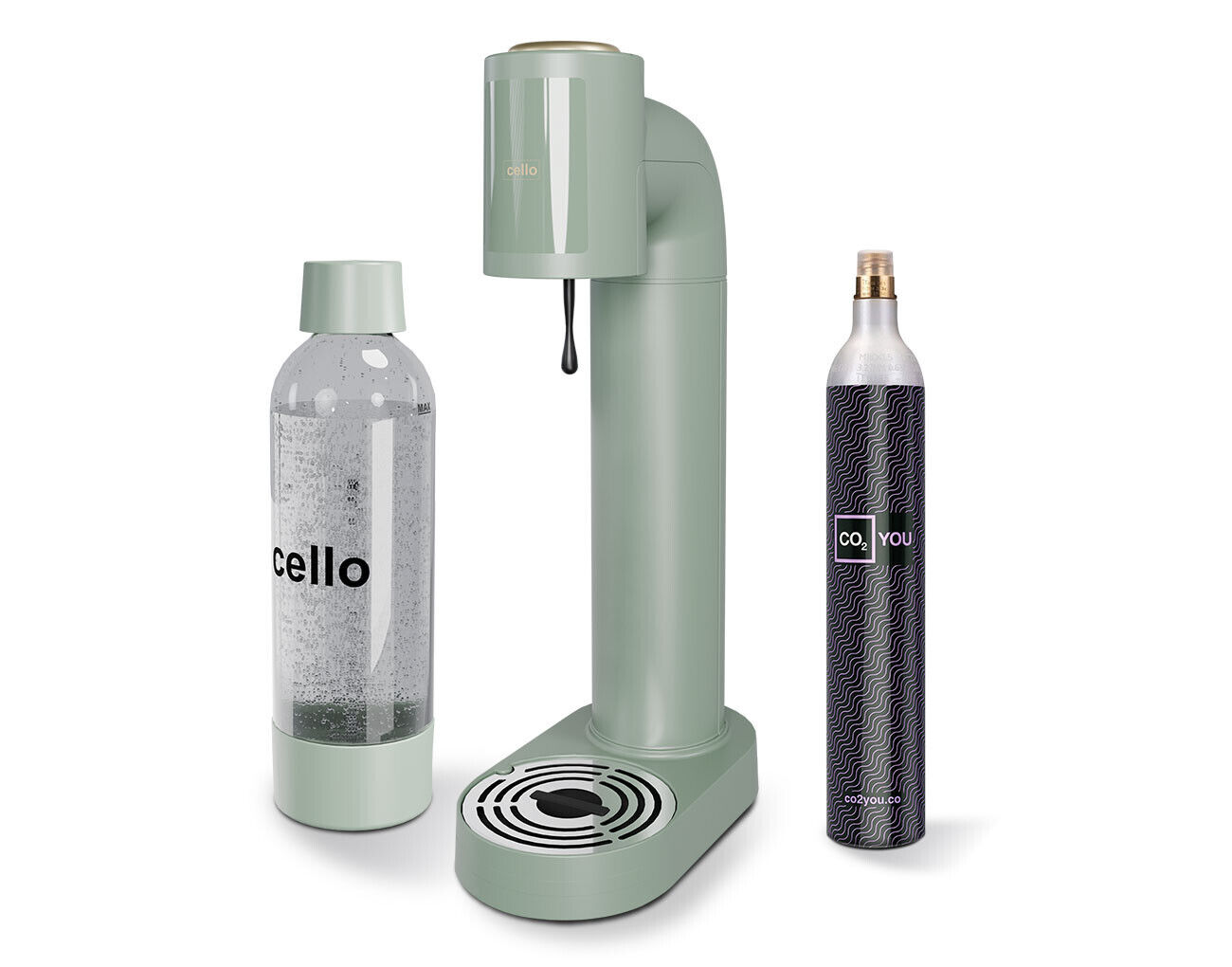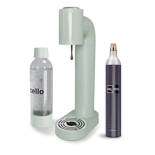 Cello Sparkling Water and Soda Maker Machine, in Sage Green with 1 Litre Reusable BPA-Free Water Bottle for Carbonating & 60 Litre Co2 Gas Cylinder | No Electricty required | Sparkling Water Maker