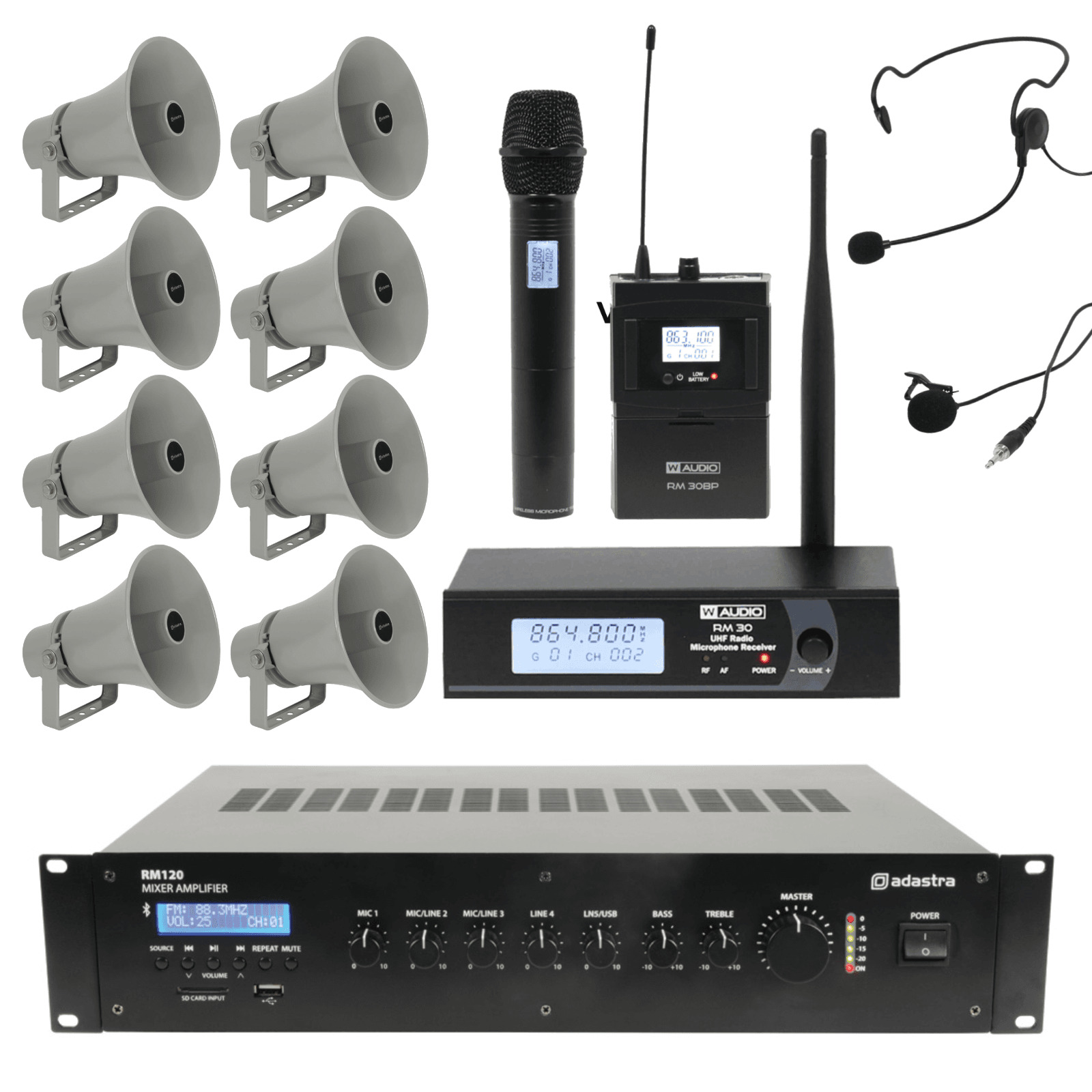 Outdoor Public Address System with 8 Weatherproof Horn Speakers & Wireless Mic