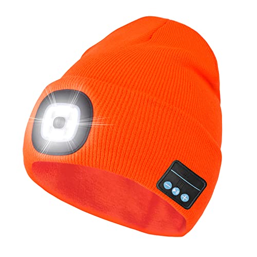 WEITOO Unisex Bluetooth Beanie Cap Light, Upgraded Musical Knitted Cap with Headphone and Built-in Stereo Speakers & Mic, Gifts for Men Women Dad Orange