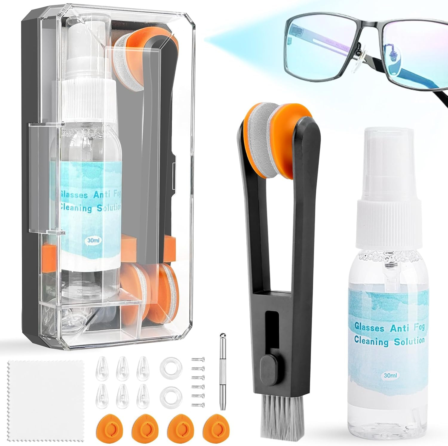 Glasses Cleaner Spray, Spectacle Cleaner with Glasses Wipes Cloth Anti Fog Spray for Camera Lens, Portable Spectacle Repair Kit with Screws, Safe for All Lens, Black