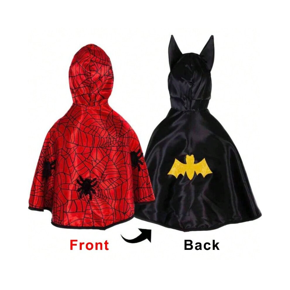 (Cape, Length 70CM) Kids Halloween Red Black Spider Web Bat Dual Sided Reversible Cape for Boys Girls Party Performance Spider-man Cosplay Dress Up