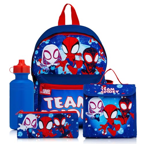 Marvel Spidey & His Amazing Friends Backpack 4 Piece School Set | Includes Backpack, Lunch Box, Water Bottle, and Pencil Case | Boys Back to School Essentials | Kangaroo Pocket & Mesh Side Pocket