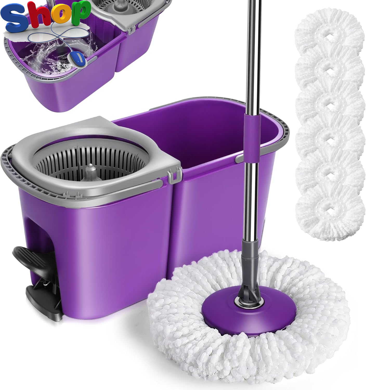 SIMPLI-MAGIC Spin Mop and Bucket with Wringer Set, Mop Bucket Cleaning System with Foot Pedal, 360°Rotation, 3 Microfiber Mop Heads
