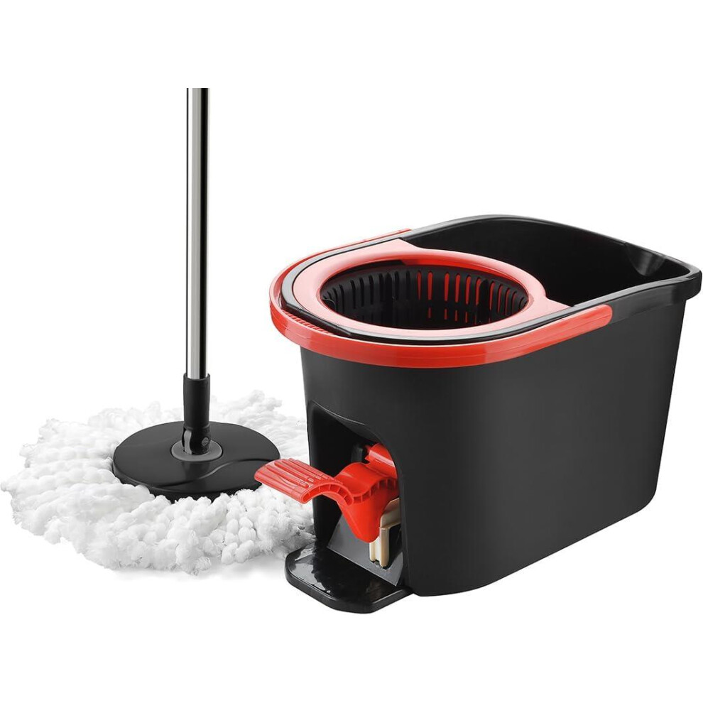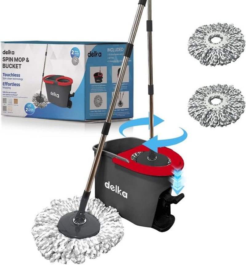 delka Spin Mop and Bucket Set – Easy Foot Pedal Water Removal, 360° Swivel Motion, Includes 2 Microfibre Mop Heads, All-Surface Cleaning, Splash Guard for Clean Mopping (Spin Mop Black and Red)