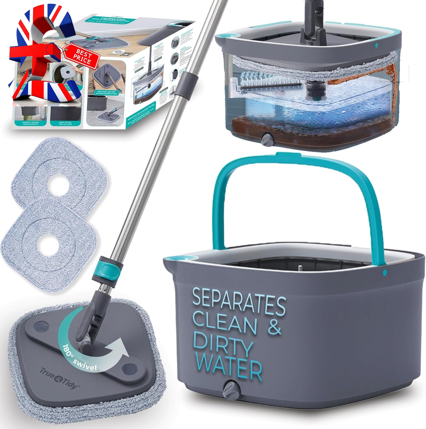 True & Tidy, True Clean Spin Mop and Bucket System, Includes Spin Mop, Dual Compartment Mop Bucket and 2 Thick Washable Microfiber Mop Pads, SPIN-800A, Gray