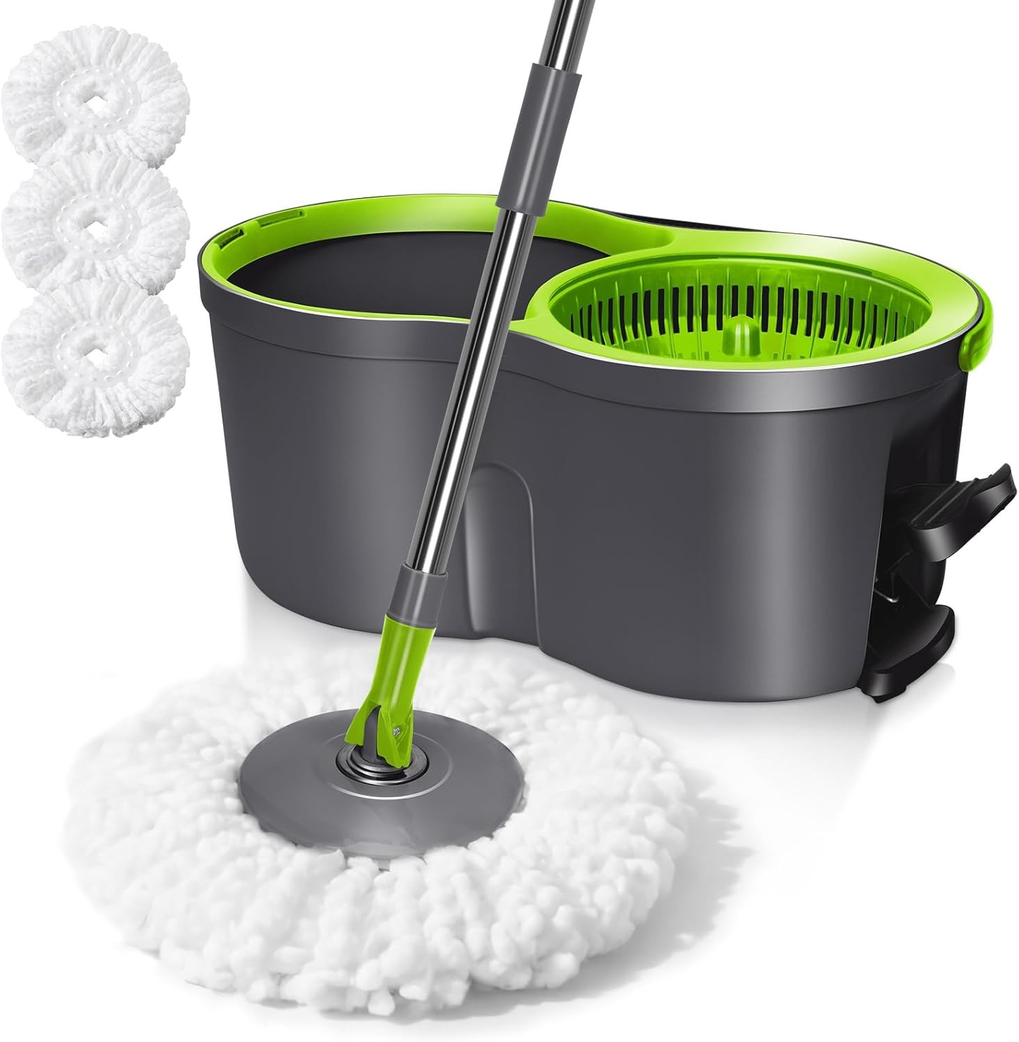 Simpli-Magic Spin Mop and Bucket with Wringer Set, 360° Spinning Mop Bucket System with 3 Microfiber Mop Replacement Heads and Stainless Steel Adjustable Handle for Floor Cleaning