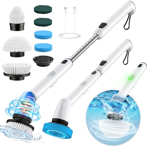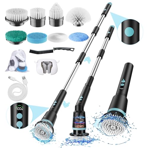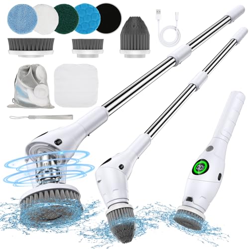 Electric Cleaning Brush, Electric Spin Scrubber with Long Handle, IPX7 Bathroom Cleaning Brush with LED Display, Bathroom Scrubber with 2 Spin Speeds, 7 Brush Heads for Shower, Tub, Kitchen