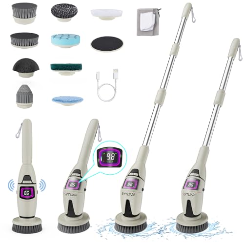 SYTUNG Electric Spin Scrubber, Electric Cleaning Brush with Ambient Light and Voice Announcement, Brush Head Can Rotate, 3 Speed Adjustment, Adjustable Extension Handle, Led Lighting