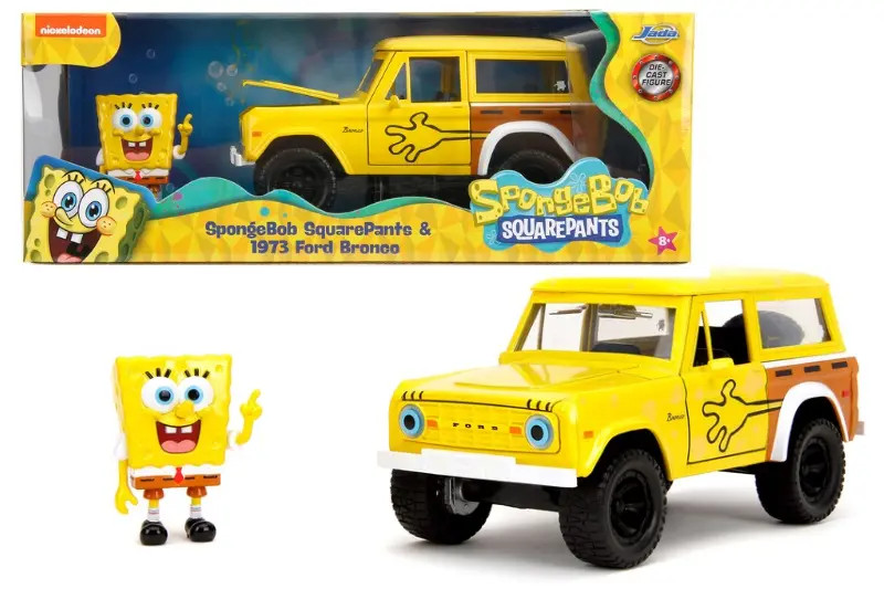 Jada Toys - Hollywood Rides 1972 Cast Ford Bronco 1:24 Scale SpongeBob Squarepants Figure - Opening Doors, Bonnet, Trunk, Rubber Tires - Collectible for Adults and Kids