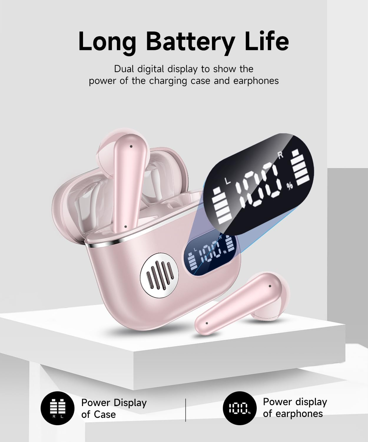 Wireless Earbuds, Bluetooth 5.3 Headphones with 4 ENC Noise Canceling Mic, 50H Stereo Dual LED Display Ear Buds, Sport Bluetooth Earphones with Earhooks, IP7 Waterproof Wireless Headphones, Rose Gold