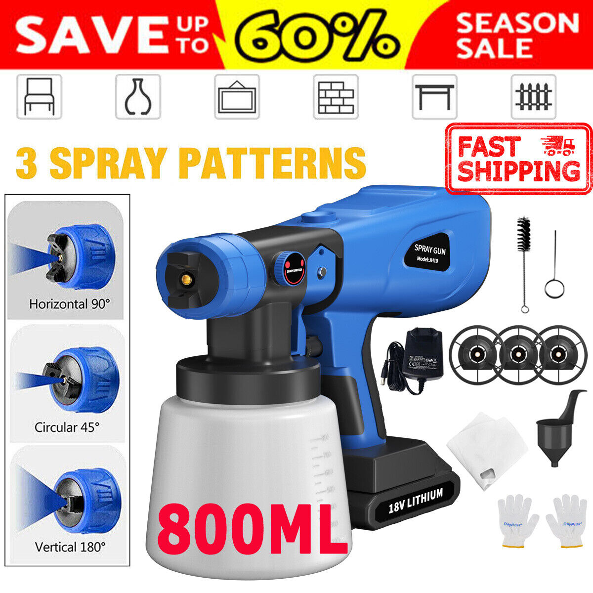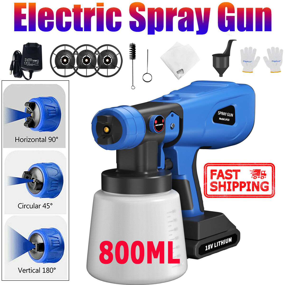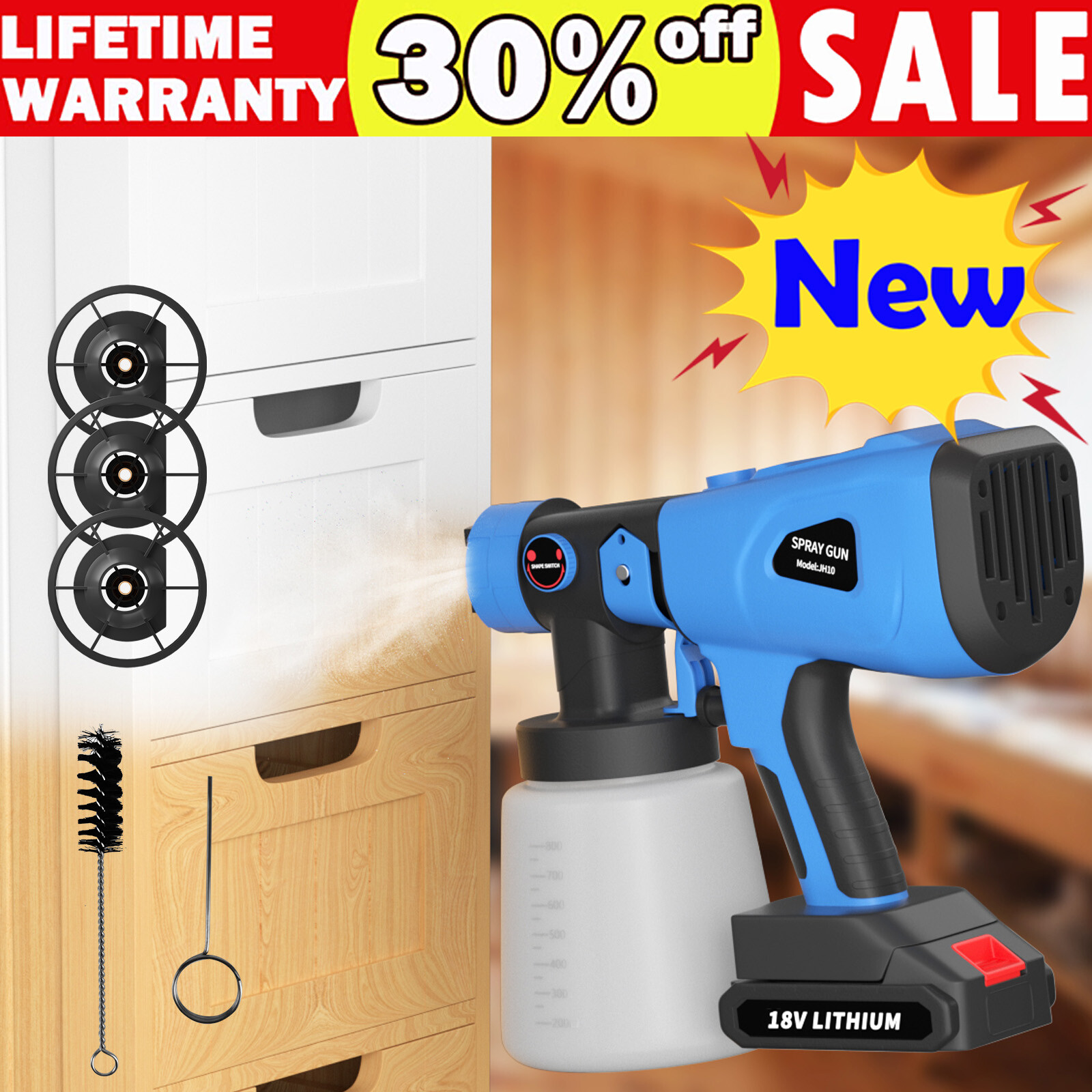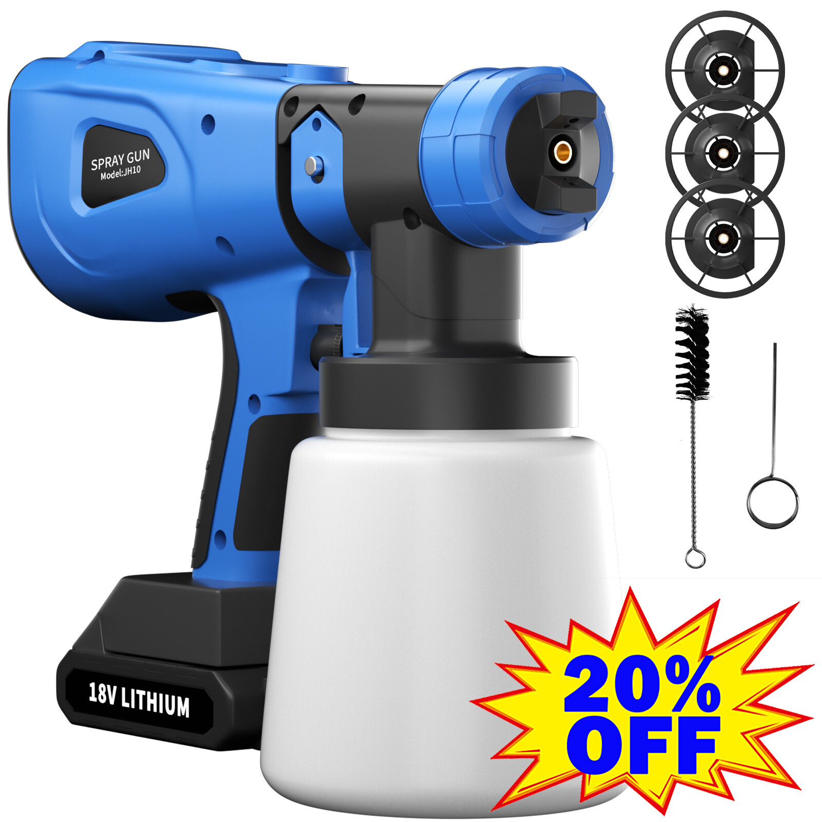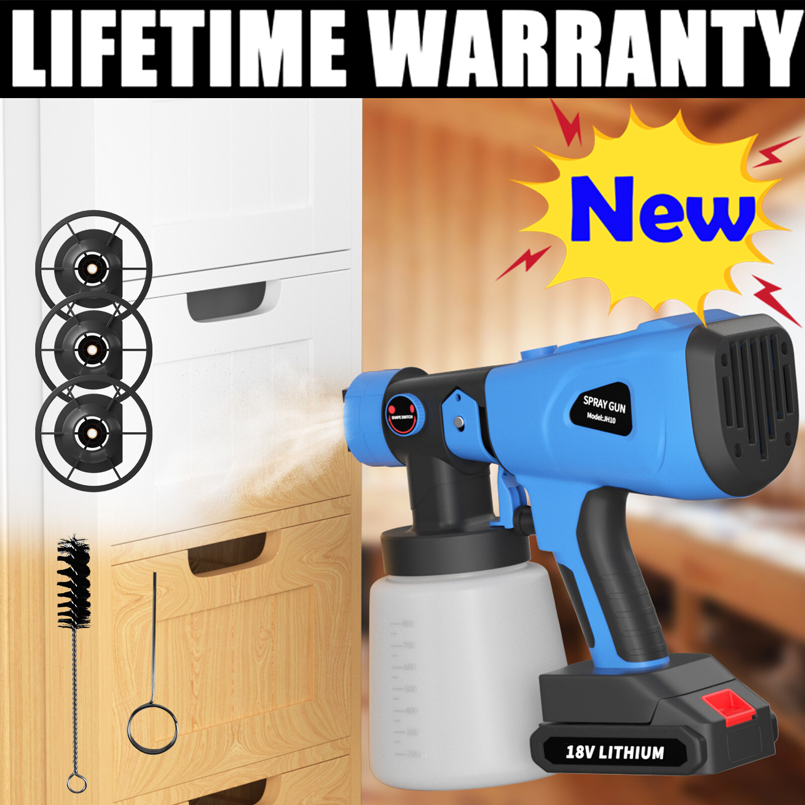 1000ML Spray Gun Cordless Fence Wall Paint Sprayer Electric Airless HVLP+4Nozzle