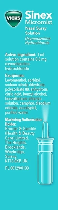 Procter & Gamble Vicks Nasal Spray, Sinex Micromist Decongestant Nose Spray For Blocked Nose With Oxymetazoline, Unblocks The Nose Fast, Blocked Nose