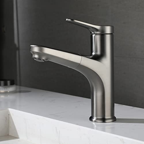 Bathroom Sink Faucet with Pull Out Sprayer, Single Hole for Brass, with 2 Modes Down, Handle Basin Mixer Tap for Hot and Cold Water,Black(Gun Gray)