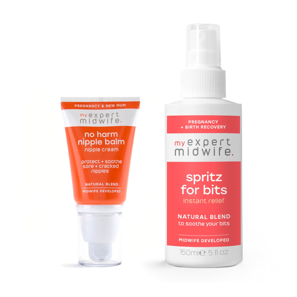 My Expert Midwife Bits and Nips - Birth Prep & Recovery Duo with Spritz for Bits Postnatal Relief Perineal Spray and No Harm Nipple Balm Nipple Cream (Pack of 2)