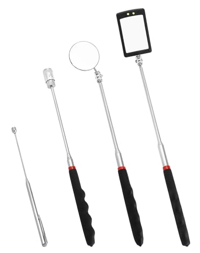 QWORK® Inspection Mirror Set, 4 Pieces, Square/Round Inspection Mirror, 8 lb Magnetic Pick-Up Tool with LED Light, 1.5 lb Pick Up Rod, No Batteries Included