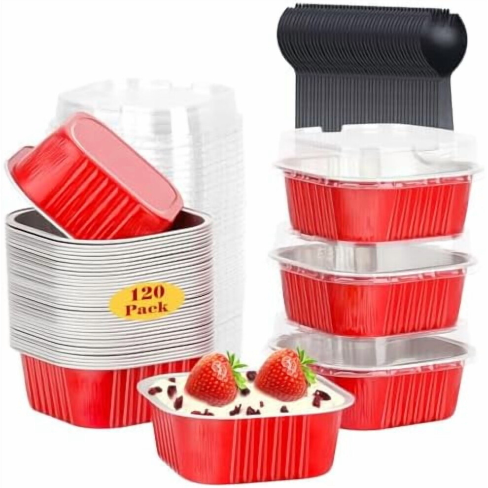 120pack 5oz Mini Cake Pans with Lids, Foil Cupcake Cups Small Brownie Baking Tins,Square Disposable Ramekins Cheesecake Containers for Christmas-Red