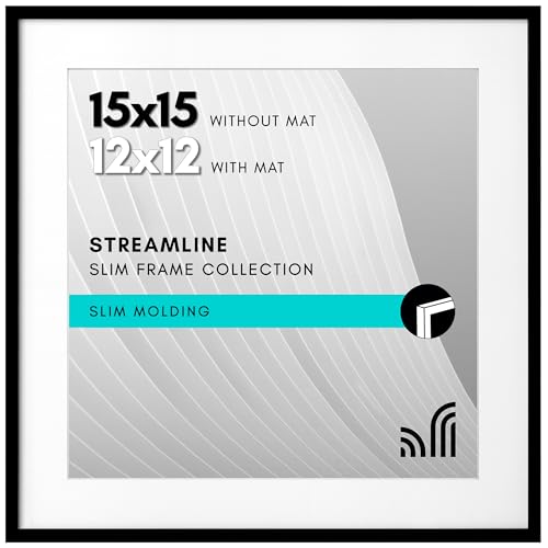 Americanflat 15x15 Picture Frame with Polished Plexiglass - Use as 12x12 Frame with Mat or 15x15 Frame Without Mat - Streamline Collection - Thin Square Picture Frame for Wall Display - Black