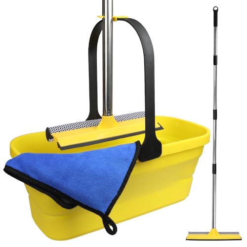 Window Squeegee and Portable Collapsible Mop Bucket,Window Squeegee with Long Handle, 2 in 1 Squeegee with Cleaning Sponge and Rubber Blade, Portable Collapsible Mop Bucket,10L(2.6 Gallon) Rectangle