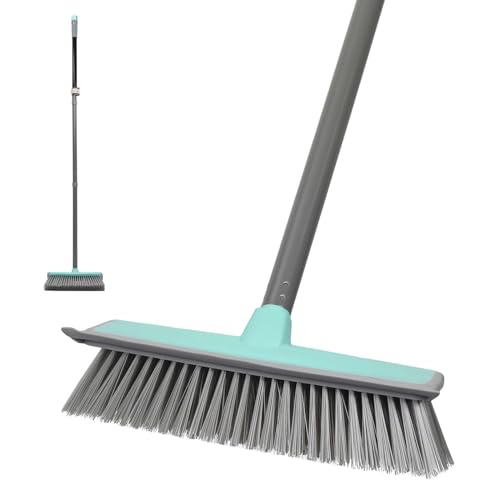 NEWE Floor Scrub Brush with Long Handle, 2 in 1 Stiff Bristles Scrubber Mop with Squeegee for Cleaning Deck Tile Tub Garage Patio Wall Sink Bathroom Kitchen