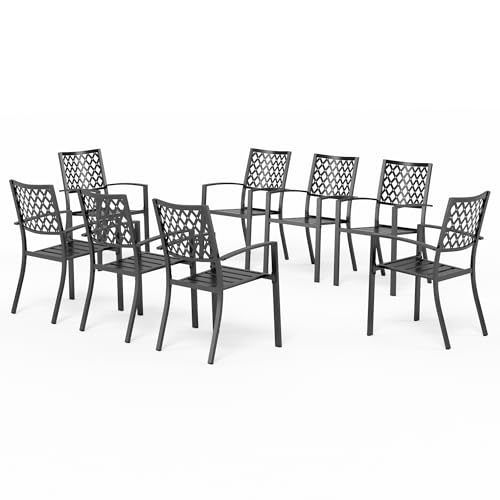 PHI VILLA Metal Garden Chairs Set of 8 Outdoor Patio Stackable Dining Chairs E-Coating Metal Frame Garden Dining Chairs With Armrests Black Weather Resistant