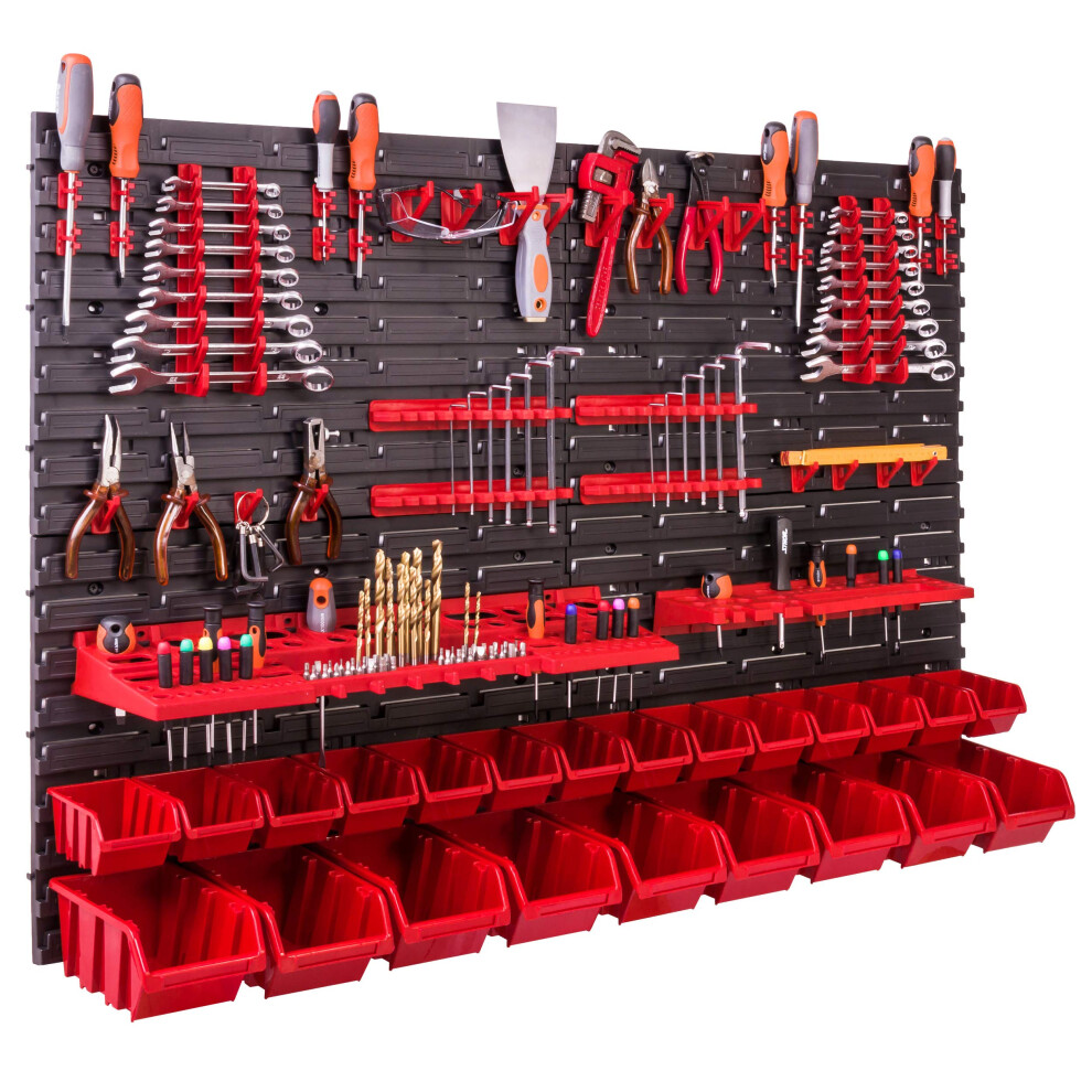 PAFEN Workshop Wall Shelf, 1728 x 780 mm, Storage System With Tool Holders and Stacking Boxes, Wall Plates, Extra Strong, Shutter Shelf (Red/Black)