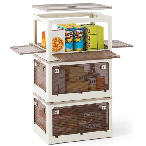 FANTASK 132L Storage Boxes with Lid, Accessible from 5 Sides, Set of 3 Stacking Boxes on Wheels, Foldable Storage Boxes, Plastic, Secure Closure, Transparent, Cream White