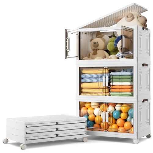 Warmiehomy Storage Box with Lid 54L*3 Tier Stackable Storage Drawers Boxes with Wheels, Foldable Collapsible Lidded Bins Containers, Plastic Stacking Drawers for Outdoor Office Home Organisation