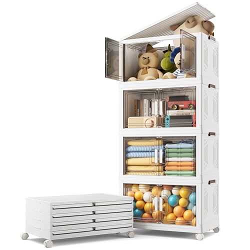 Warmiehomy Storage Box with Lid 54L*4 Tier Stackable Storage Drawers Boxes with Wheels, Foldable Collapsible Lidded Bins Containers, Plastic Stacking Drawers for Outdoor Office Home Organisation
