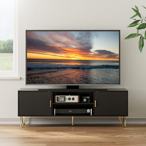 HEYZOEY Black Wood TV Stand for up to 65 Inch TV, 137cm TV Unit with 2 Cabinets and Open Shelves, Modern TV Console Table for Living Room,53.9 x 15.0 x 18.9 inches