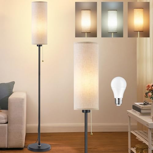 Seruno X Floor Lamp Linen Standing Lamp with Pull Chain Switch 3 Color Temperatures, 9W Led Bulb Included, Modern Black Pole Standard Corner Lamp with Lampshade for Living Room Bedroom, No Remote