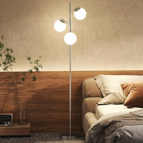 HOMCOM 3-Light Tree Floor Lamps for Living Room, Modern Standing Lamp for Bedroom with Globe Lampshade, Steel Base, Bulb not Included, Silver Tone