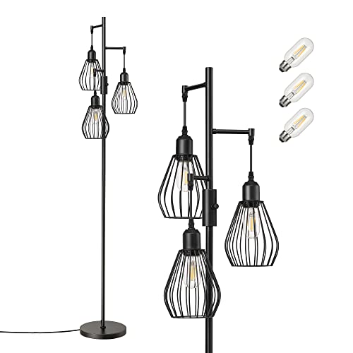 EDISHINE Industrial Floor Lamp, Dimmable Standing Lamp with Wire Cage Lampshade, Floor Lamps for Living Room, Bedroom, E27 Sockets, 3 LED Bulbs Included, Black Metal